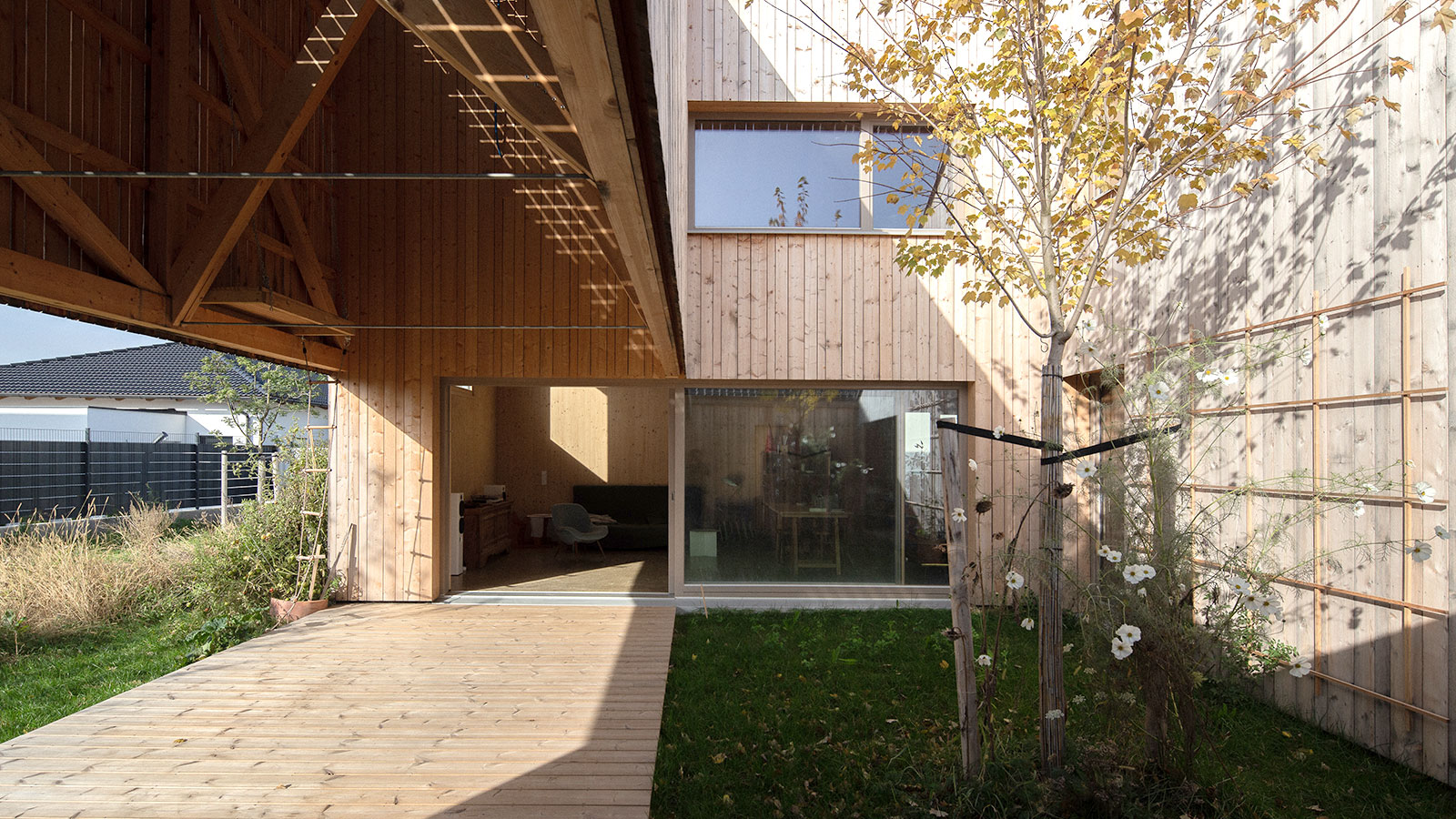 großzügiger Innenhof mit Terrasse und einem Ahorn