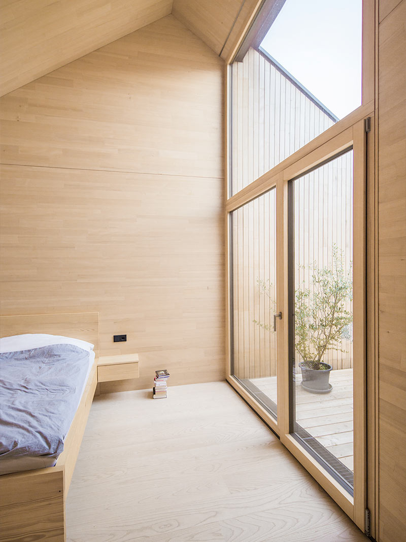 Obergeschoss Fassade aus astfreier, stoßfreier, sägerauher, nicht sichtbar befestigter Weißtanne
